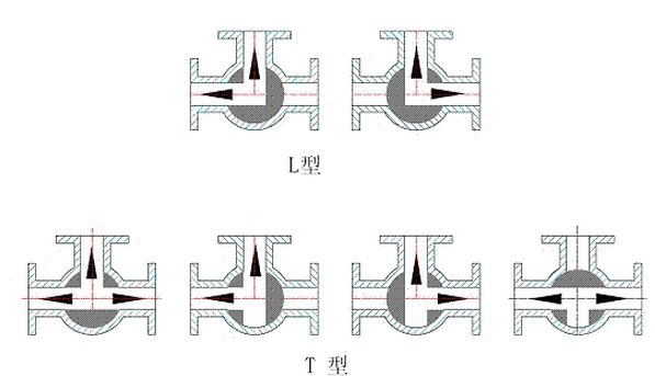 L型流道的三通4面閥座球閥,采用2面閥座。主要用于流路的換向。T型流道的三通4面閥座球閥,采用4面閥座,受力平衡,保證閉止通道上可靠密封。主要用于分流、混流、換向以及三通道的完全開放。