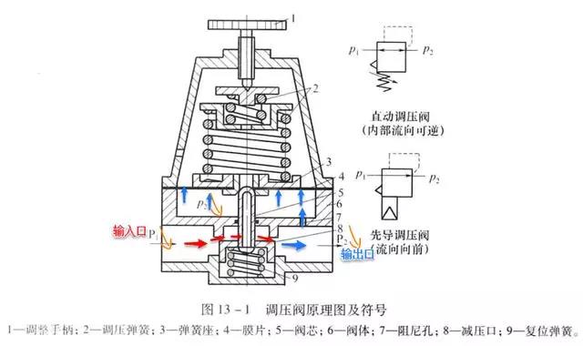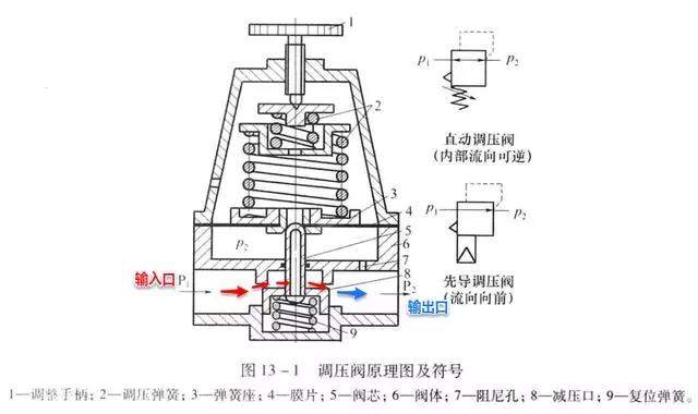 如圖所示,如果輸入壓力P1突然升高,則輸出壓力顯然也會隨之升高,對應(yīng)的膜片4下方的壓力也會增高,膜片向上運(yùn)動;且閥芯5在復(fù)位彈簧9的作用下也會向上推動膜片,從而使減壓閥口8趨于閥口開度減小的位置,閥口的節(jié)流作用就增強(qiáng)了,直至輸出壓力P2降低,使膜片上下兩端的壓力再次達(dá)到平衡,減壓閥口的輸出壓力再次趨于穩(wěn)定。