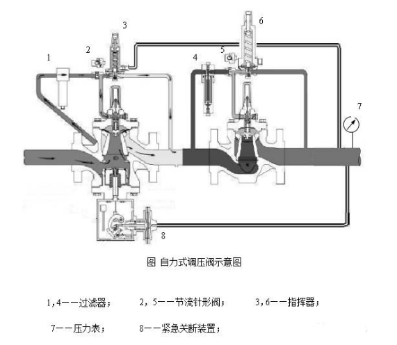 自力式調(diào)壓閥主要由指揮閥、調(diào)壓閥、節(jié)流針閥、導(dǎo)壓管、緊急關(guān)斷等組成(如圖)