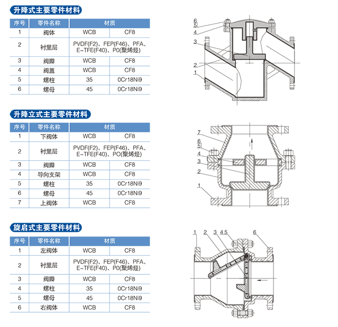 主要型號有全襯里,H42F46立式止回閥,是一種新型結(jié)構(gòu),閥瓣為圓弧型,它們共同特點是襯氟閥瓣沿閥體通路軸線做升降運動。