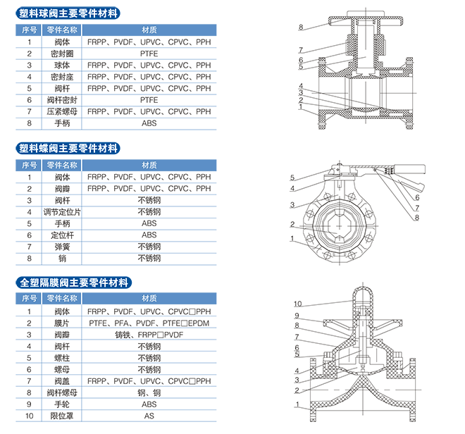 主要型號有Q41F型全塑球閥等。塑料球閥耐腐蝕性能優(yōu)良,密封圈采用F4,密封可靠,啟閉力矩小,流體阻力小,啟閉迅速,結(jié)構(gòu)簡單,外形美觀。材質(zhì)衛(wèi)生無毒,耐磨損、容易拆卸,維護簡單易行。